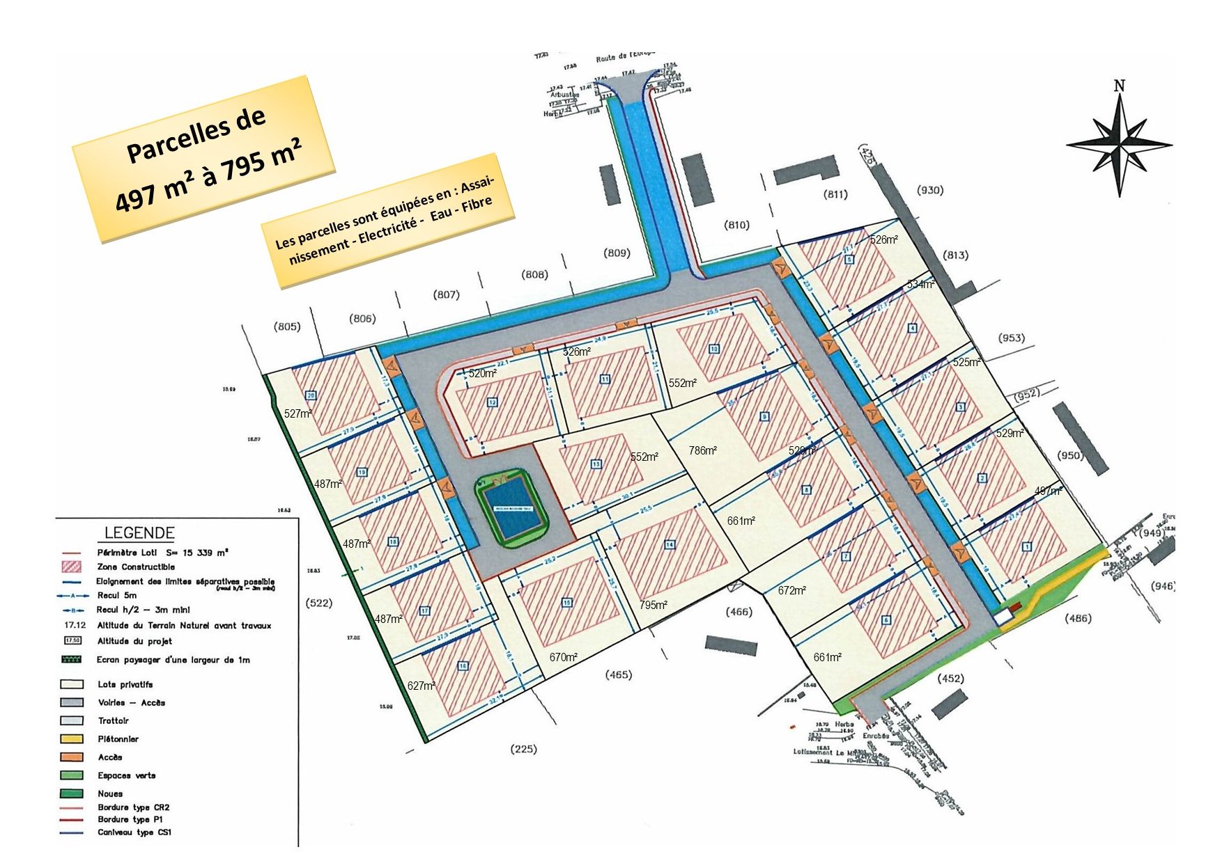 lot 19 surface : 487m² - Façade : 18 m - 69.500€ - Provision Frais acquisition : 7210€ Equipé en Assainis - Eau - Fibre - Borné